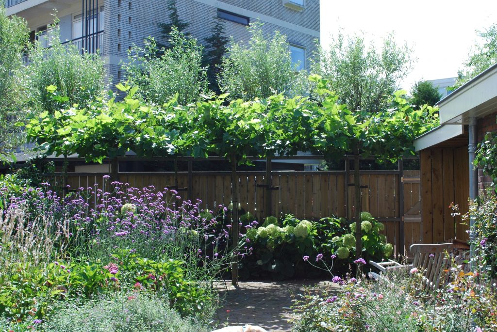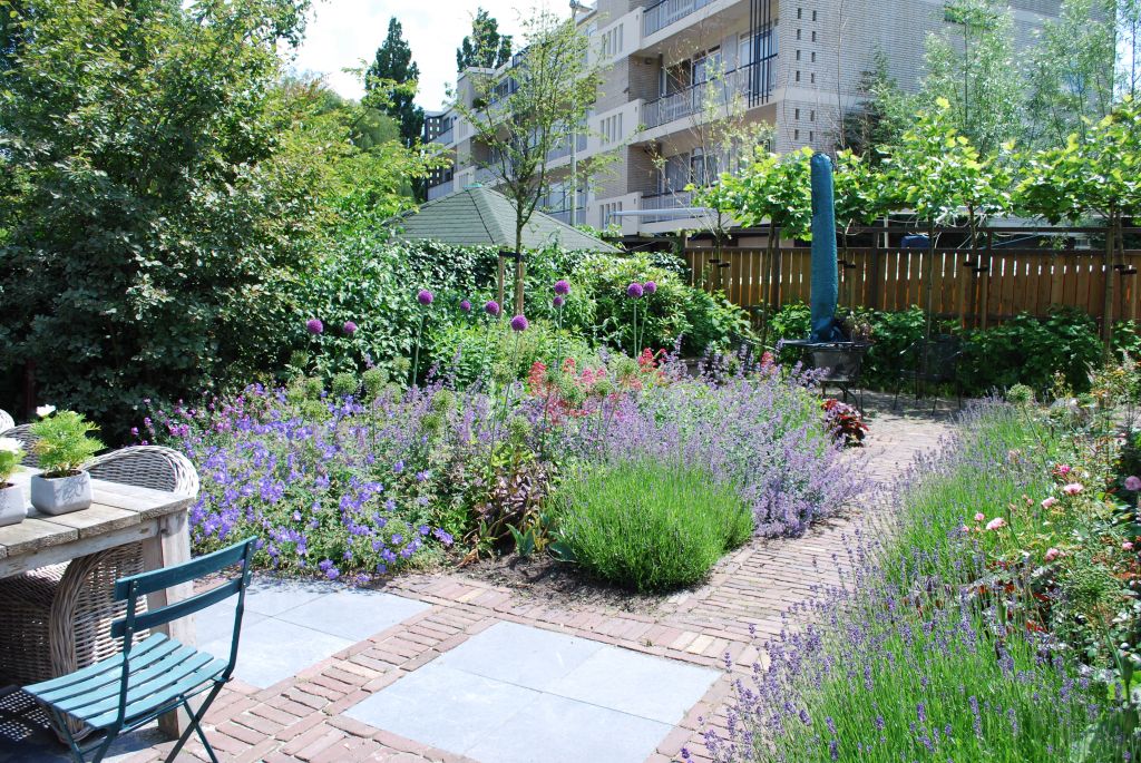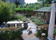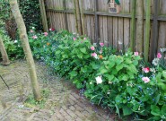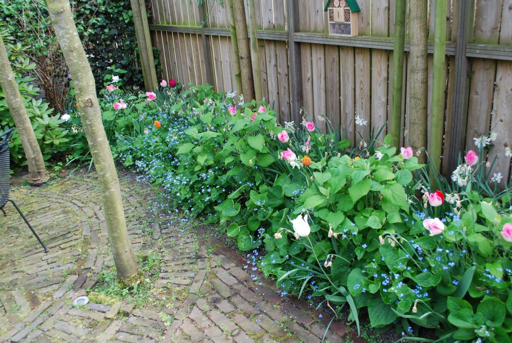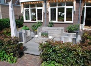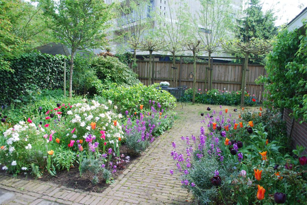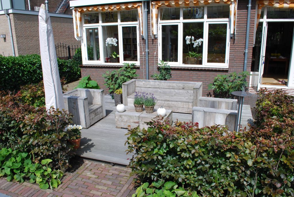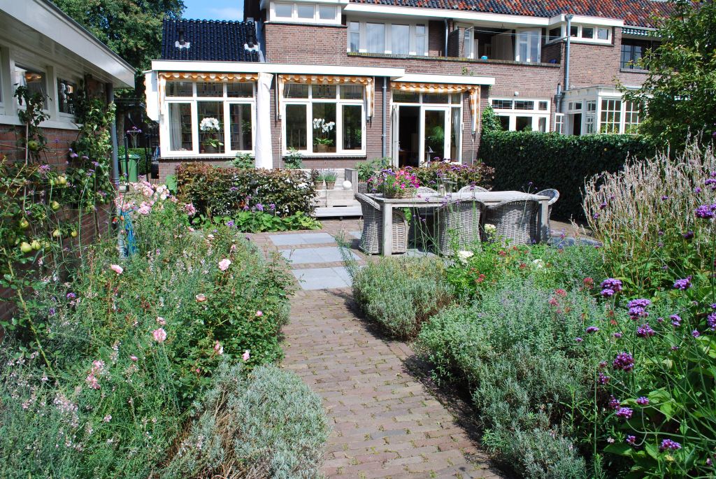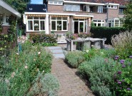 Met drie terrassen kan je altijd ergens in de zon of de schaduw zitten. Tegen het huis aan staat op een vlonder een set van steigerhout. Een trede lager staat een grote eettafel met stoelen. Achterin de tuin onder de platanen staat een klein zitje.De bestrating van de oprit, terrassen en de paden heeft verschillende patronen waardoor het straatwerk niet saai wordt. Behalve terrassen en paden zijn er alleen borders waar we door hun afmeting een enorme variëteit aan planten kwijt kunnen. In het voorjaar staan er tulpen en daarna allerlei kleuren elkaar op tot in de late herfst. Achterin de tuin staat een dubbele rij bomen ven dakplataan en wilg.