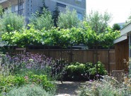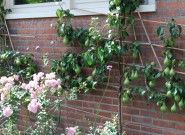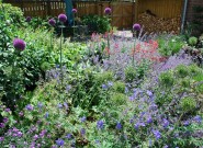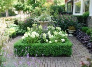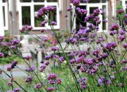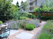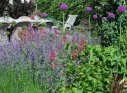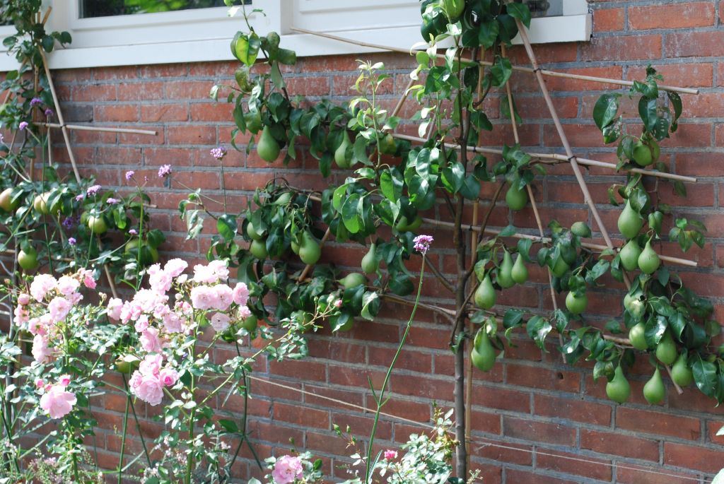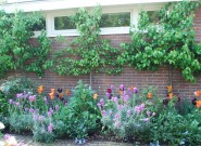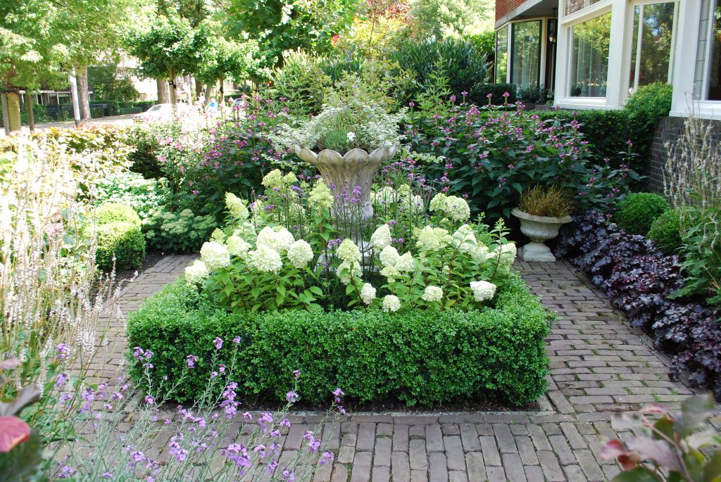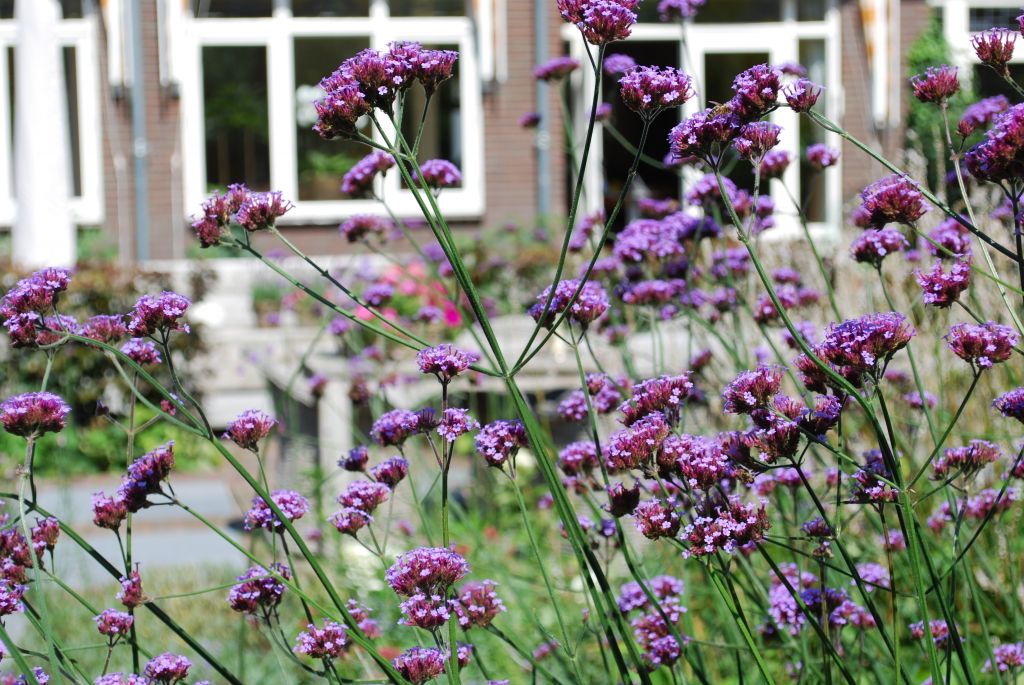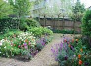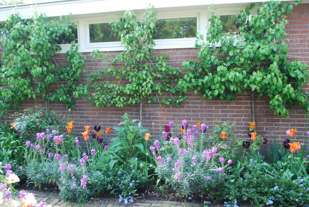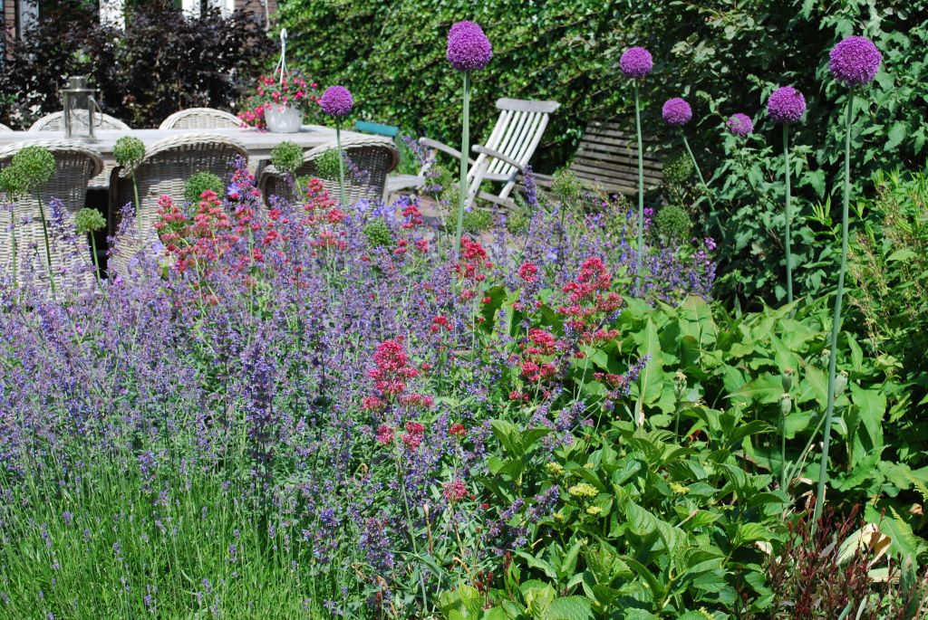 Met drie terrassen kan je altijd ergens in de zon of de schaduw zitten. Tegen het huis aan staat op een vlonder een set van steigerhout. Een trede lager staat een grote eettafel met stoelen. Achterin de tuin onder de platanen staat een klein zitje.De bestrating van de oprit, terrassen en de paden heeft verschillende patronen waardoor het straatwerk niet saai wordt. Behalve terrassen en paden zijn er alleen borders waar we door hun afmeting een enorme variëteit aan planten kwijt kunnen. In het voorjaar staan er tulpen en daarna allerlei kleuren elkaar op tot in de late herfst. Achterin de tuin staat een dubbele rij bomen ven dakplataan en wilg.