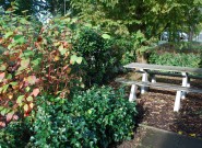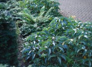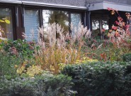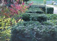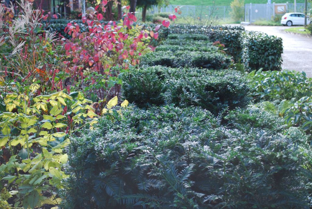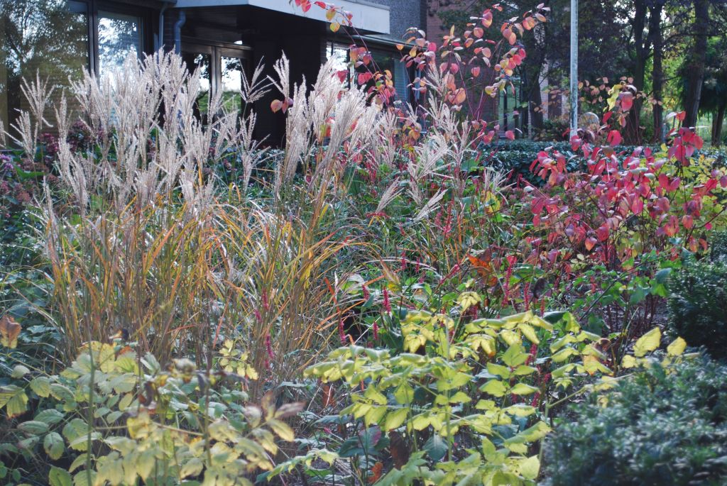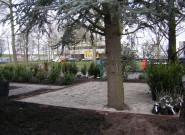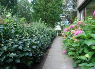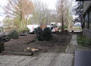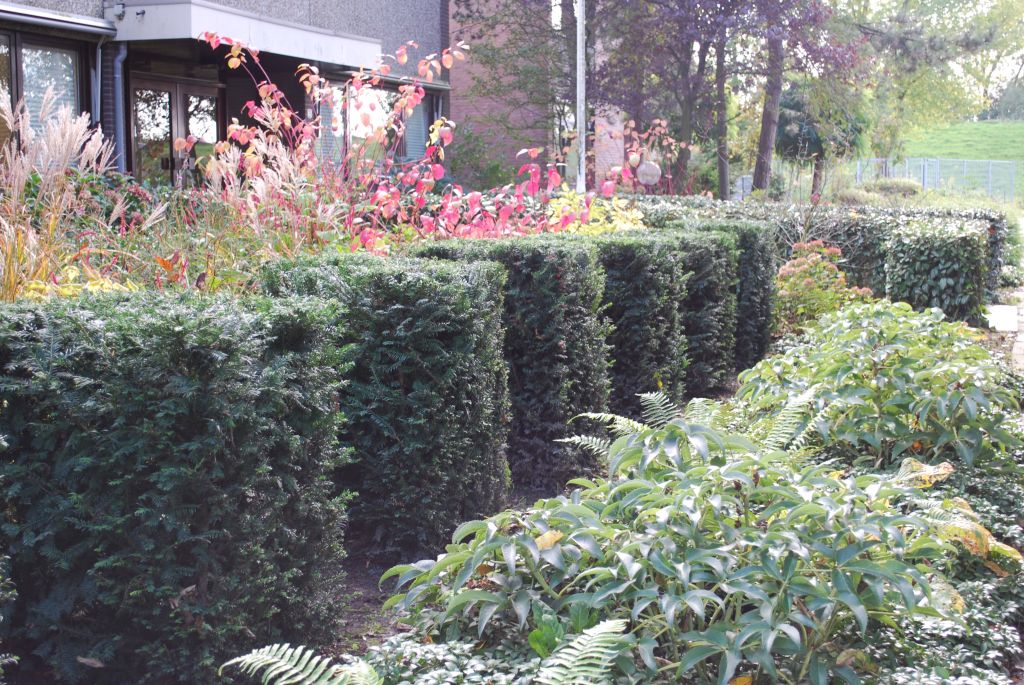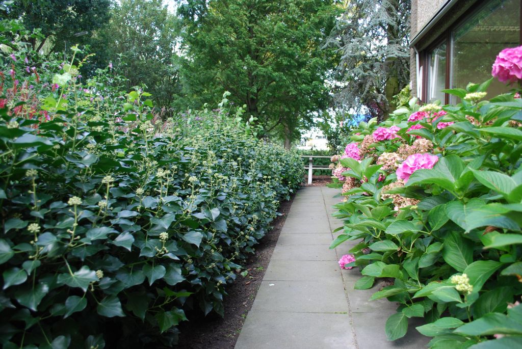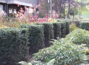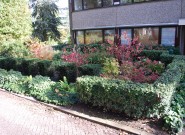 Waarom geen mooie tuin bij je kantoorpand? De eigenaar van dit bedrijf wilde graag veel groen om zich heen. We hielden rechte lijnen aan in de bestrating en brachten met taxusblokken structuur in de borders. Ondanks veel groenblijvende planten is het aangezicht van de tuin kleurrijk door gebruik van grote groepen bloeiende planten.