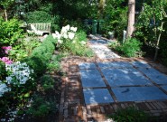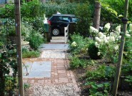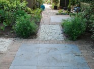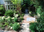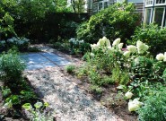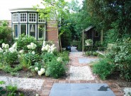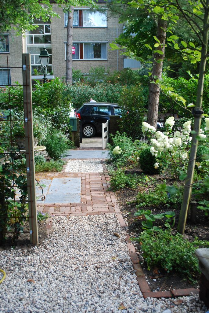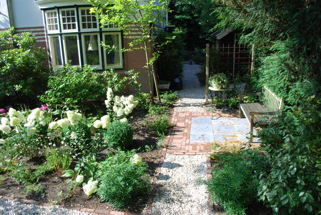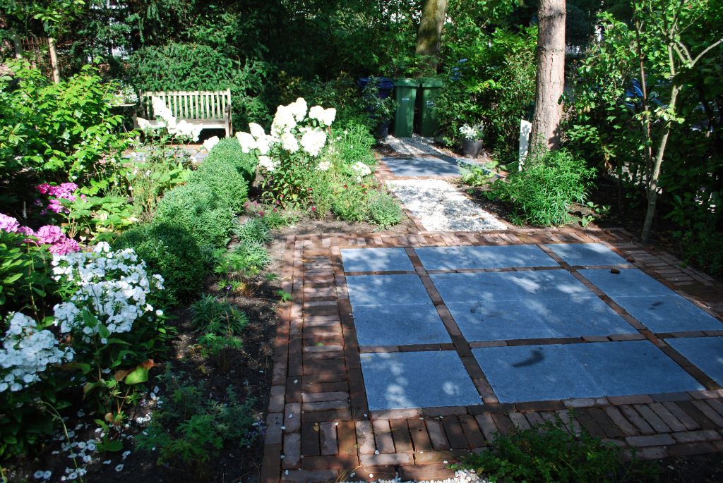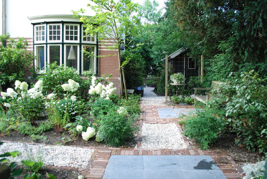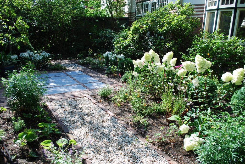 Het huis is bijzonder dus daar hoort een bijzondere voortuin bij. We kozen voor blokken met verschillende bestratingspatronen verbonden door paden van grind. De beplanting is overwegend wit.